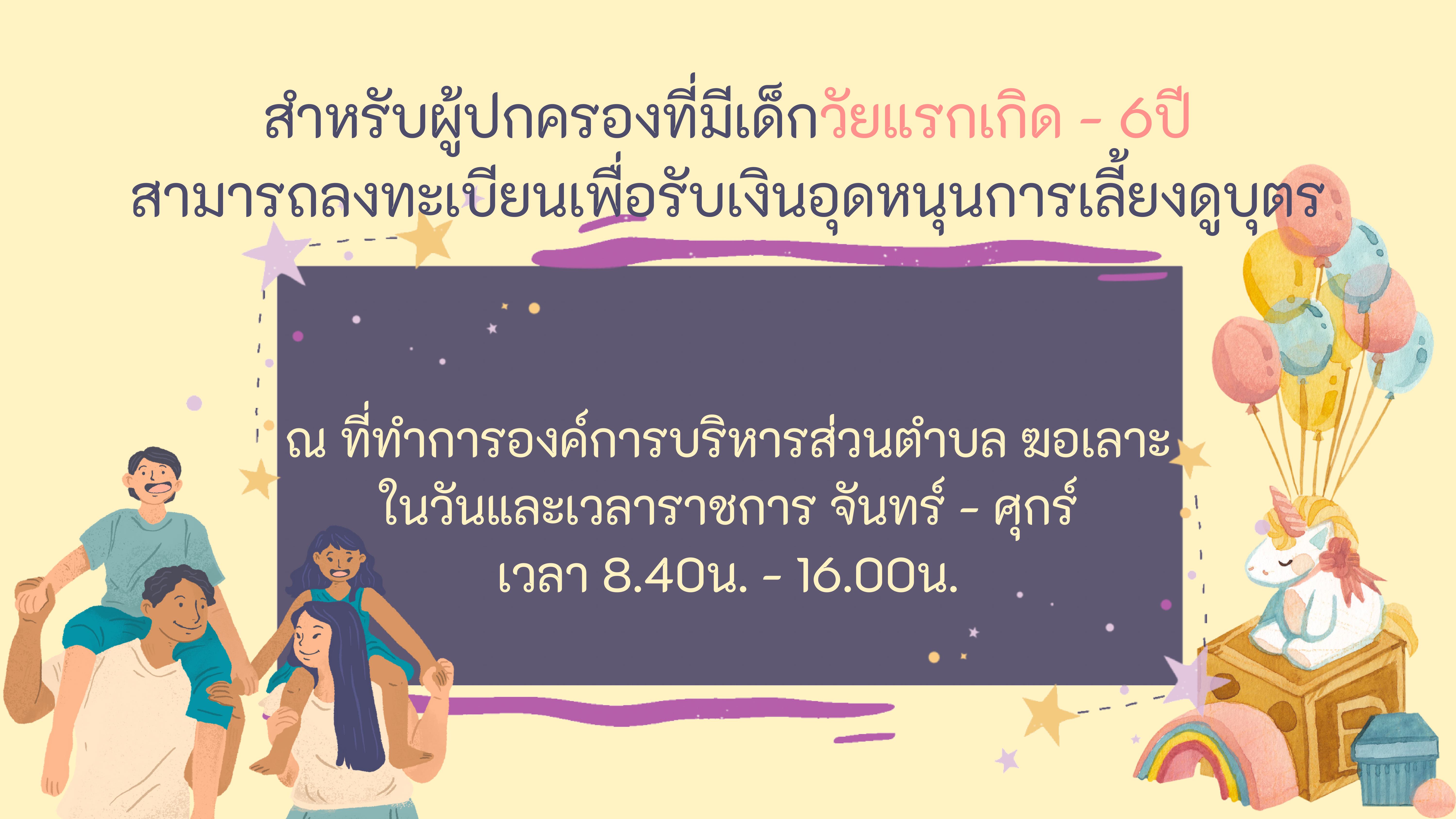สำหรับผู้ปกครองที่มีบุตรหลานวัยแรกเกิด - 6 ปี สามารถลงทะเบียนเพื่อรับเงินอุดหนุนการเลี้ยงดูบุตรได้ ณ องค์การบริหารส่วนตำบลฆอเลาะ ในวันและเวลาราชการ สำหรับผู้ปกครองที่ไม่สะดวกส่งเอกสารผ่านทางองค์กรปกครองส่วนท้องถิ่น สามารถลงทะเบียนเองผ่านทางแอป "เงินเด็ก" สามารถดูวิธีลงทะเบียนเพิ่มเติมได้ตามลิ้งค์ที่แนบ
